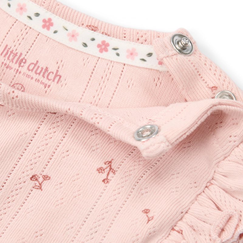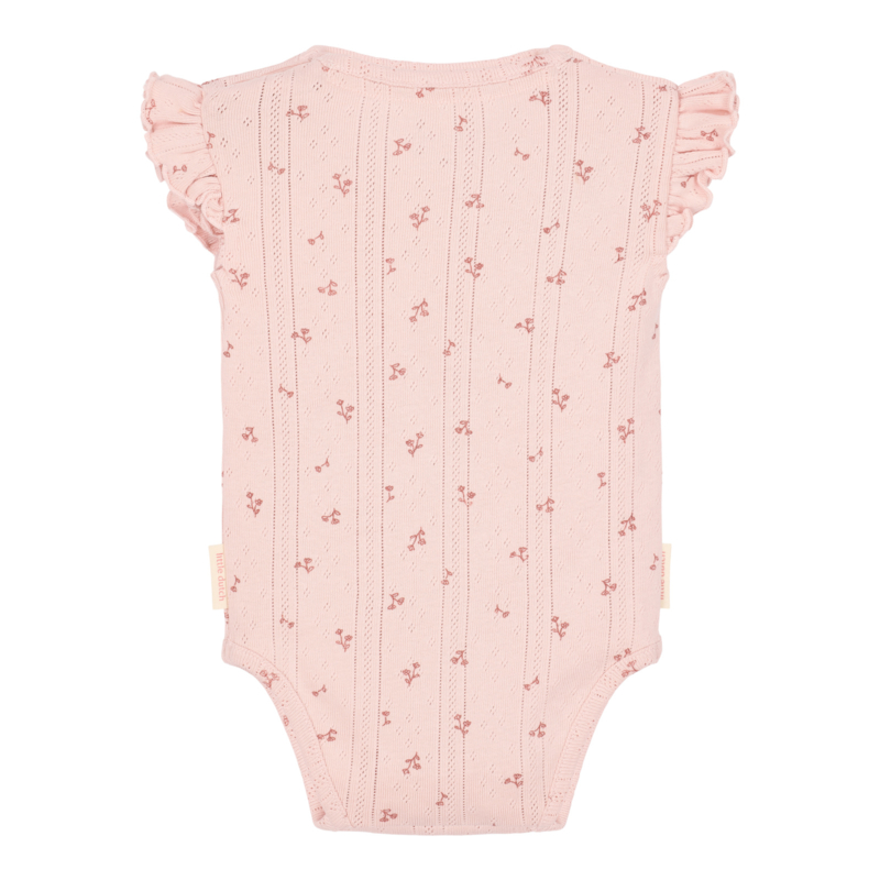 Deze lieve mouwloze romper in zacht roze is versierd met het subtiele Fairy Flowers-thema, kleine bloemenprintjes die een gevoel van verwondering geven. De schattige ruches op de mouwtjes maken het geheel extra lief en bijzonder.