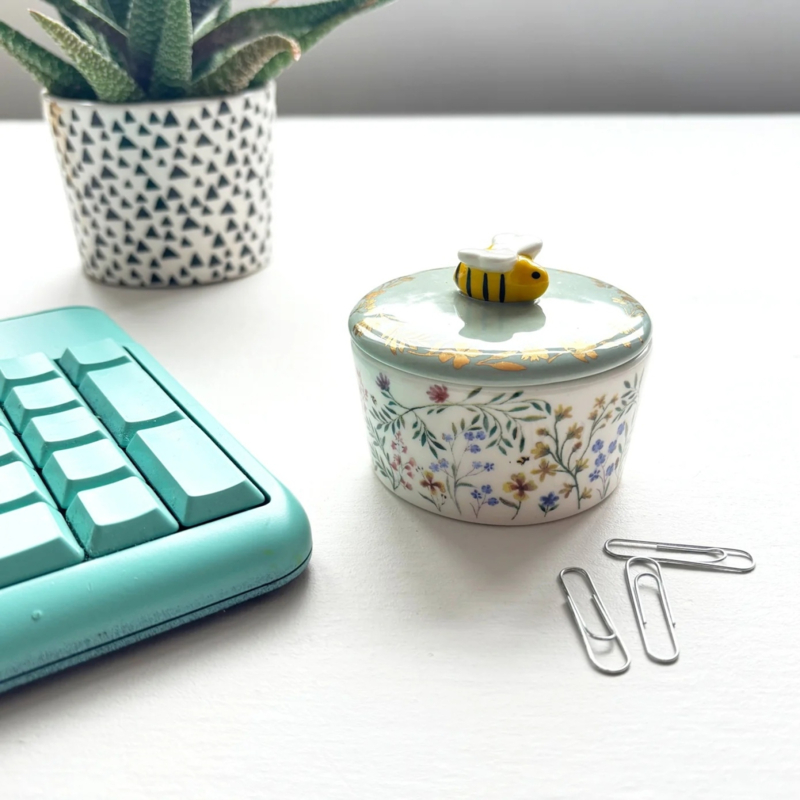 Artikelnummer: 040-SECTRIBEBreng de charme van een Engelse tuin in huis met dit Secret Garden bijen sieradenpotje. Een schattige 3D-keramische bij rust op een turquoise deksel, omringd door bladeren en bloemen met subtiele gouden folieaccenten. Dit zorgt voor een speelse en tegelijkertijd elegante uitstraling die prachtig staat in elk interieur.
