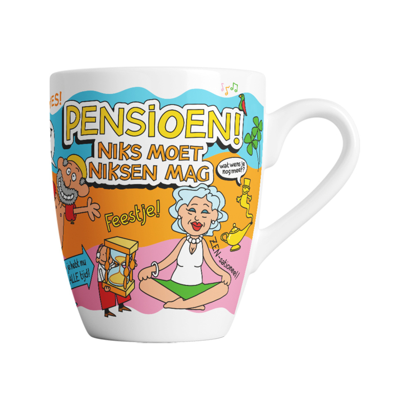 Artikelnummer: 116De Cartoonmok “Pensioen, niks moet” van Paper Dreams is een vrolijk en origineel cadeau voor iedereen die met pensioen gaat. De mok is voorzien van een grappige cartoontekening met de tekst “Pensioen, niks moet”, waardoor hij meteen een eyecatcher wordt op het bureau, in de keuken of tijdens een koffiepauze.